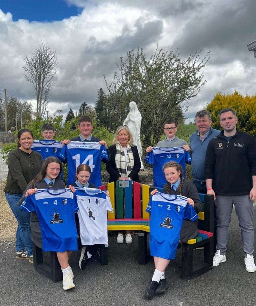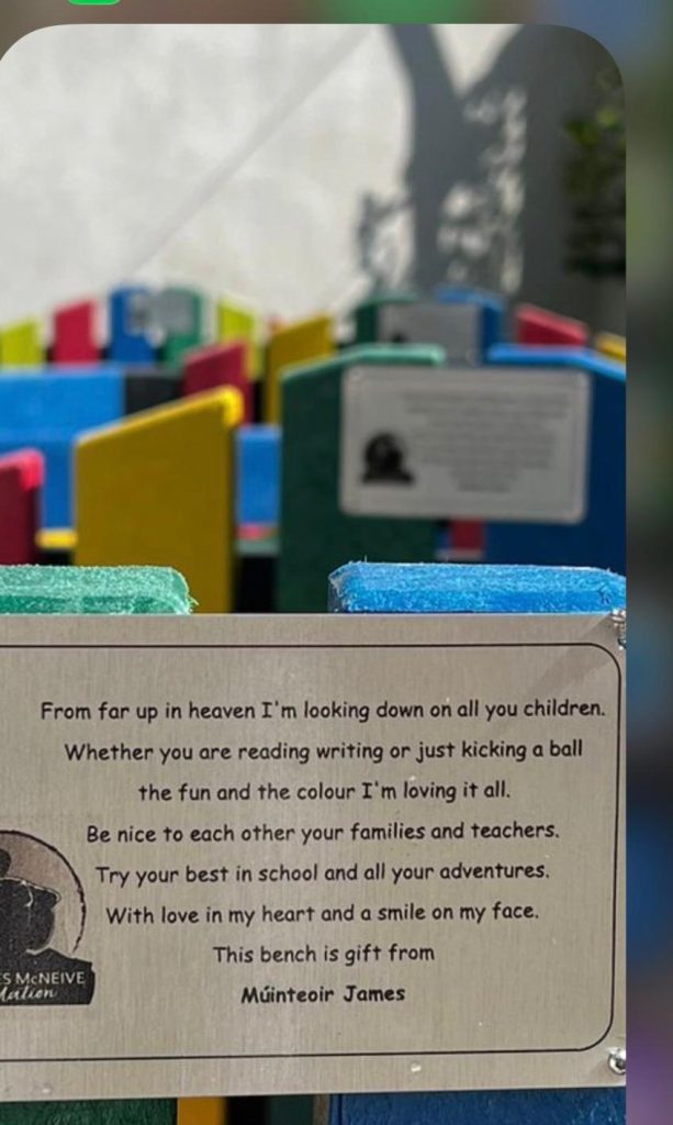 A huge thank you to The James McNeive Foundation on presenting our school with a set of new jerseys and a buddy bench. James was a former student and teacher in our school. He is so fondly remembered for his kindness, gentleness, dedication and friendship. With these gifts his spirit in Bekan NS continues even stronger.
